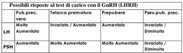 I livelli di FSH ed LH in circolo risultano aumentati. Il test con le gondadotropine determina un aumento dell'LH. Nella pubertà precoce vera il test con il GnRH determina un aumento del FSH e l'LH appare molto aumentato. Se il bambino presenta il telarca è l'FSH che è molto aumentato.