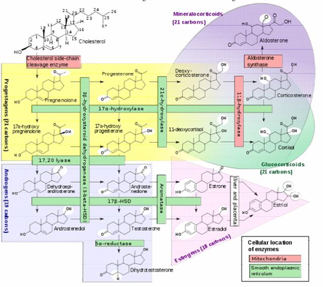 L'incremento di ACTH è causato da livelli bassi di cortisolo, la cui sintesi è compromessa dall'assenza o dalla riduzione di uno dei cinque enzimi necessari per la sua produzione dal colesterolo. Ciascun blocco enzimatico determina un deficit caratteristico e l'accumulo di precursori specifici degli ormoni surrenalici. Nelle forme più comuni di iperplasia surrenalica congenita (SAG), i precursori prossimali al blocco enzimatico si accumulano e sono convogliati verso la sintesi di androgeni surrenalici.