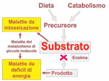 La malattia metabolica è una condizione patologica che si verifica in mancanza di un enzima che determina un aumento a monte del substrato e una riduzione a valle del catabolita.
