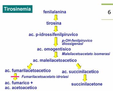 Eziopatogenesi: il difetto di base è a carico della fumaril-aceto-acetato liasi (idrolasi) o deficit di tirosina