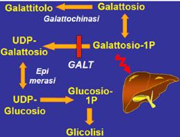 Vi è un grave danno epatico, con necrosi epatocellulare con ittero. La galattosemia è una delle cause di colestasi del neonato. La mortalità nei primi giorni di vita in seguito ad insufficienza epatica e renale è elevata.