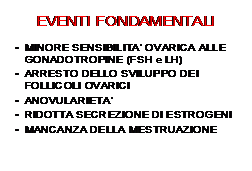 La << del numero di ovociti più la mancata sensibilità a LH,FSH porta in menopausa ad un >> di FSH. Si considera menopausa, per convenzione, l'assenza di mestruazione per 10-12 mesi con un >> di LH,FSH e ipoestrogenismo, infatti si passa da uno stato ( Climaterio) di irregolarità mestruale,oligomenorrea alternati a periodi di amenorrea, fino alla vera amenorrea. Di fronte ad un amenorrea fare sempre il bhcg! Perché vi sono stati vari casi di menopausa che poi hanno avuto un ovulazione e sono rimaste in gravidanza.