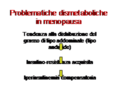 Nella menopausa abbiamo una distribuzione androide, noi diciamo che da pera ci trasformiamo a mela. Una donna in climaterio necessita un controllo tiroideo, perché vi possono essere dei noduli che possono diventare maligni. Può comparire un'intolleranza al glucosio e insulino-resistenza, e riscontro frequente di IPA.
