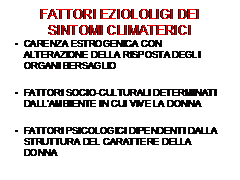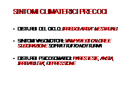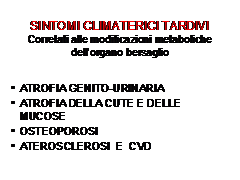 Solo chi ha situazioni di depressione precedente sviluppa depressione in menopausa, che viene causata dal progestinico. I sintomi si distinguono in precoci, intermedi e tardivi, quelli intermedi ( che lei ha masso nei tardivi)i sono quelli dell 'atrofia. L'utero si involve, le ovaie pure,nella cute vi sono modificazioni perché gli E intervengono sul collagene, quindi cominciano a formarsi le rughe,perché viene meno il collagene che da sostegno alla cute. La sintomatologia vasomotoria ( vampate di calore) può essere confusa con quella depressiva, bisogna fare DD con i sintomi dell'insonnia, vampate la pz non ha un solo sintomo, ma ha tutti questi sintomi che rientrano nella Sindrome Climaterica.