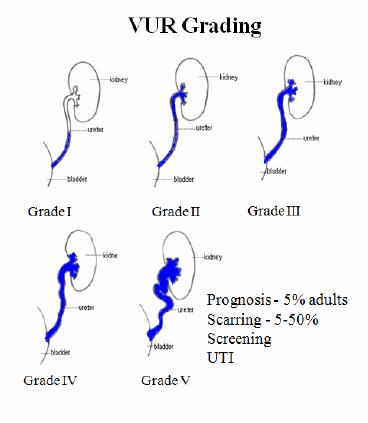 Tuttavia la VCUG (Voiding Cysto-Urethrogram) con radioisotopi non fornisce una definizione anatomica della vescica, non permette una precisa gradazione del reflusso, non dimostra un diverticolo paraureterale, o se il reflusso avvenga in un sistema collettore doppio o in un uretere ectopico. Nei maschi è importante la definizione radiografica dell'uretra; si raccomanda, quindi, la VCUG con contrasto per la valutazione iniziale.
