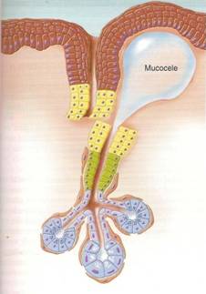 L eziologia del mucocele è un trauma meccanico al dotto escretore della ghiandola salivare minore. Ciò comporta uno stravaso di muco nel tessuto circostante con conseguente reazione da corpo estraneo. Questo trauma è causato più frequentemente da una morsicatura, da un apparecchio odontostomatologico, da un tappo di una penna. La sede più frequentemente colpita è il labbro inferiore. Si manifesta con una tumefazione (da pochi mm a diversi cm di diametro) asintomatica teso-elastica con superficie liscia, bluastra se è più superficiale o rosea se è più profonda, circondata da processo infiammatorio periferico. L età più colpita è prima dei 0 anni.