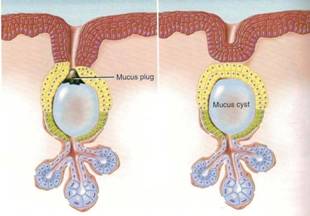 Sono dovute ad un ostruzione del dotto escretore con conseguente accumulo di muco a monte dell ostruzione. Le sedi più colpite sono il lobo superficiale della parotide e le ghiandole salivari palatine e la maggiore insorgenza è oltre i 30-40 anni.