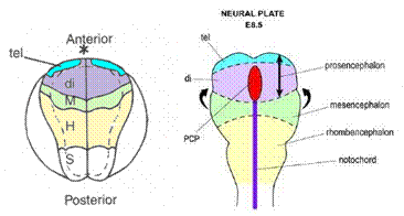 A partire dallo stadio di piastra neurale tardiva, nelle regioni più anteriori si accende il gene Bf1 a delineare le regioni del telencefalo da quelle del diencefalo, prima che si