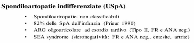 TIPO I (artrite cronica giovanile): esordisce nei primi 5 aa di vita, è prevalente nel sesso femminile, mostra una positività agli ANA nel 90% dei casi e si associa al rischio di iridociclite cronica;
