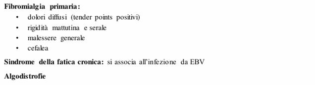 Emocromo: emoglobinopatie (ad esempio l'anemia a cellule falciformi si manifesta con dolori articolari), infezioni, ARG (macrocitosi, leucopenia, piastrinopenia), LES, leucemia;