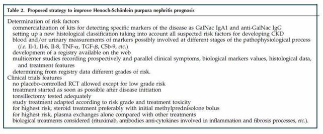 Il bambino deve continuare a fare una dieta regolare, deve essere idratato e bisogna evitare la somministrazione di aspirina, in quanto responsabile della sindrome di Reye. Infine, non bisogna mai sottovalutare il rischio di una recidiva. Esistono fattori che possono predire il rischio di una eventuale ricaduta. Il primo elemento è un'età superiore ai 30 anni, poi seguono una porpora che persiste per più di un mese, dolori addominali, ematuria, una grave leucocitoclasia, la presenza di IgA in assenza di IgM.