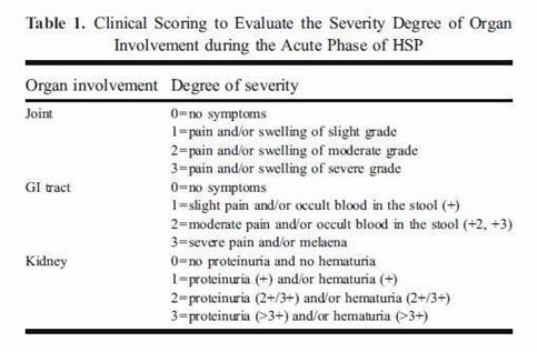 Per quanto riguarda la biopsia, si potrebbe effettuare anche una biopsia renale, tuttavia si ricordi che l'interessamento renale non è sempre presente ed inoltre esistono aree di tessuto più facilmente reperibili, come la cute, quindi la biopsia deve essere effettuata, a maggior ragione che si tratta di soggetti pediatrici, sulla cute. La diagnosi differenziale deve essere posta nei confronti delle altre vasculiti sistemiche e patologie associate con porpora trombocitopenica (porpora trombocitopenica idiopatica, leucemia e LES). Si sottolinei come, un parametro molto importante da valutare al momento della presentazione clinica sia la pressione arteriosa. In caso di ipertensione la prognosi è meno favorevole.