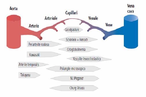Lo schema mostra le principali vasculiti, riportando anche le sedi che sono