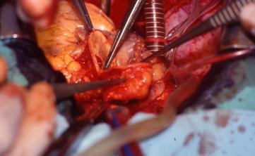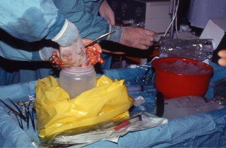 Vengono sezionate la vena cava superiore, la cava inferiore e l'aorta prossimalmente al clamp; vengono sezionate le vene polmonari di destra e, sollevato l'apice del cuore, le vene polmonari di sinistra. Infine si eseguono le sezioni dell'arteria polmonare destra e sinistra dopo la biforcazione. L'organo asportato viene posto in un recipiente contenente soluzione salina fredda a 4°C. E' poi necessario procedere alla separazione adeguata dei grossi vasi, all'apertura dell'atrio destro e della vena cava inferiore verso l'auricola per la preparazione della cuffia atriale destra procedendo anche all'ispezione del setto interatriale ed alla preparazione della cuffia atriale sinistra.
