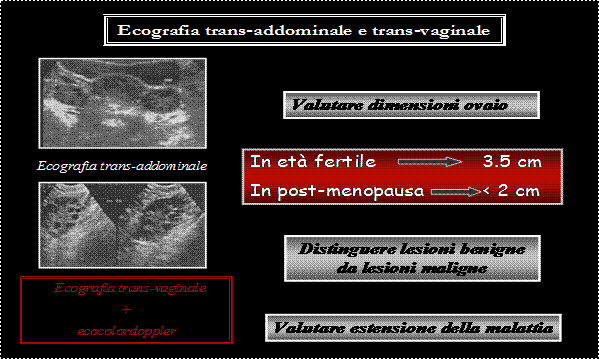 L'unico raziocinio sono i fattori di rischio, il tumore è + frequente dopo la menopausa, perciò esame pelvico eco soprattutto transvaginale, ricerca delle dimensioni dell'ovaio che se in menopausa o in perimenopausa suerano i3cm bisogna sempre sospettare l'inizio di una patologia ovarica che a quest'età predispone per una patologia di tipo maligno. Il tumore una volta insorto da un'alta mortalità dei casi colpiti.