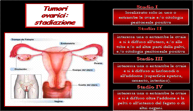 Quella dei tumori ovarici è una patologia purtroppo molto diffusa ed insidiosa la cui sintomatologia è scarsa a differenza del cancro dell'utero che da una sintomatologia ben precisa, il cancro all'endometrio da delle metrorragie cioè perdite ematiche al di fuori del ciclo, noi abbiamo la possibilità di diagnosticare precocemente tale patologia, a differenza del k della portio che non da una sintomatologia ma essendo la portio aperta verso l'ext grazie alla vagina possiamo fare lo screening con l'esame citologico e fare la diagnosi precoce o fare prevenzione quando la lesione è ancora allo stadio di lesione preneoplastica con le se varie gradualità, a differenza di tutto questo i tumori ovarici danno scarsissima sintomatologia. Questo è il motivo per cui la mortalità per questo tipo di tumore è elevata, quando noi lo diagnostichiamo spesso ha già superato la capsula, il limite costituito dalla parete dell'ovaio e ha già dato diffusione agli organi vicini e lontani.