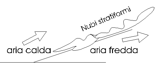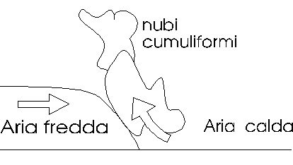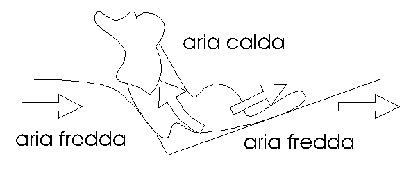 - In altri casi una massa d'aria in movimento orizzontale è costretta a risalire semplicemente per la presenza di rilievi montuosi o in seguito all'incontro di una massa d'aria più fredda e densa che le si incunea sotto. In tal modo si raffredda sia per contatto con la superficie più fredda che per l'espansione adiabatica dovuta alla risalita.
