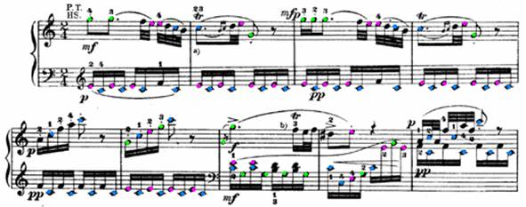 come possiamo notare in questi due semplici righi, il grande genio di Mozart ci consente di cogliere le leggi dell'armonia; guardate come si susseguono infatti con frequenza le note poco fa elencate, soprattutto nel basso.