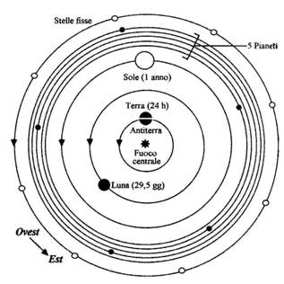 Il sistema dei Pitagorici, o Italici secondo la definizione aristotelica, è riassumibile nella descrizione di Filolao (V secolo a.C., contemporaneo di Socrate, fu il pitagorico che mise per iscritto le concezioni della scuola, fino ad allora considerate segrete).