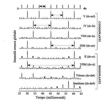 Nel grafico è rappresentato l'andamento nel tempo dell'intensità sonora percepita ai fini della generazione degli impulsi neurali. Come si può notare l'intervallo do-sol ha un andamento molto regolare che consente la formazione di un impulso facilmente interpretabile. Al contrario il semitono do-do per la sua scarsa regolarità ci dà un forte senso di dissonanza.