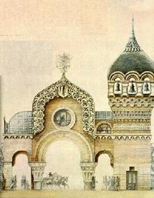 Il progetto di Hartmann[10] per una porta commemorativa nella città di Kiev in stile russo, con cupola a forma di elmo slavo, offre uno spunto a Mussorgskij per esaltare con toni trionfali tutta l'antica gloria della Russia attraverso un brano a carattere processionale, un' apoteosi sottolineata nel 1929 dalla coloratissima orchestrazione di Ravel.