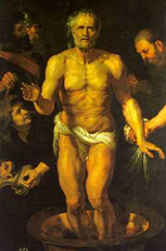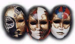 eleganti abiti di foggia secentesca, il volto e il capo coperti di argilla
