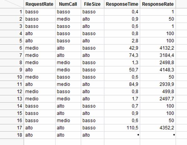 Per progettare l'esperimento si è usato il metodo del Fractional Factorial Design: dal Full Factorial Design, che avrebbe previsto un numero di esperimenti pari a 3*3*2=18, sono state eliminate le configurazioni che avrebbero portato il server a un funzionamento oltre il punto di usable capacity. L'osservare tutti le combinazioni ci porta a poter determinare non solo i fattori significativi ma anche le interazioni di secondo livello tra di essi.
