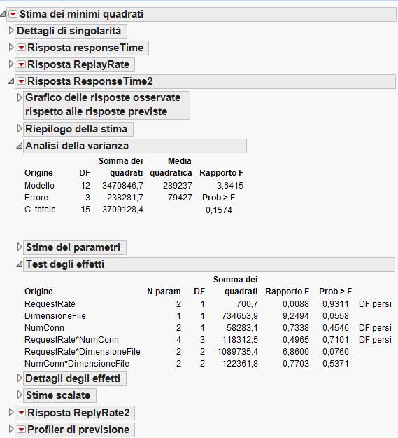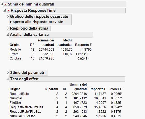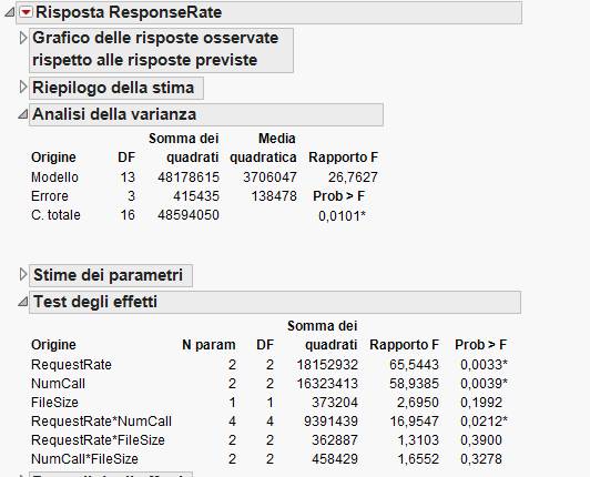 Per le stesse considerazioni fatte sopra, possiamo dire che il RequestRate e il numCall esprimono circa l'80% della variabilità ( circa 38% per il primo), e che la loro interazione spiega circa il 17%; possiamo anche dire che questi due parametri e la loro interazione sono significativi con più del 95% di confidenza (guardando prob >F). Considerazioni analoghe per il fattore FileSize che non è importante né significativo.