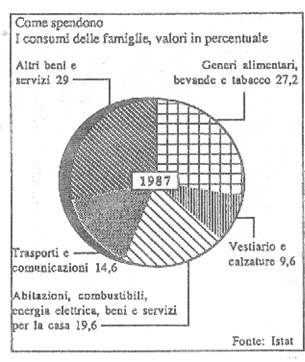 c) I diagrammi a settori circolari utilizzano un angolo giro, (che si fa uguale all'intero fenomeno) che viene diviso in 'spicchi' in proporzione alle frequenze relative a ciascuna modalità. Vediamo anche in questo caso un esempio pratico che evidenzia come spendono e quanto sono ricche le famiglie in Italia.