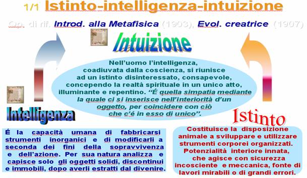 Tuttavia l'intelligenza ha sull'istinto una superiorità infinita, proprio come strumento di liberazione dello spirito dalla materia. Essa, pur essendo strumento d'azione, tende alla conoscenza teorica della realtà. L'istinto ha una conoscenza perfetta del suo oggetto, ossia di quella porzione di vita che più direttamente l'interessa, ma limitata a quell'oggetto. L'intelligenza invece ha una conoscenza superficiale e imperfetta dei suo oggetti, ma non si fissa in essi, oltrepassa di continuo l'azione che compie, ha una capacità infinita d'estendersi; più che le cose coglie i rapporti tra le cose, circola in mezzo agli oggetti senza vincolarsi e trascende continuamente se stessa come "se cercasse ciò che non è capace di trovare" (paradossalmente superiore all'istinto che trova ciò che non è capace di cercare). Istinto e intelligenza vengono così posti da Bergson come in un rapporto dialettico di opposizione e di complementarietà,in un rapporto di antitesi che esige una sintesi superiore. Questa sintesi è rappresentata dall'intuizione. "Se la coscienza che sonnecchia nell'istinto si risvegliasse, si interiorizzasse in conoscenza invece che esteriorizzarsi in azione, se noi sapessimo interrogarlo ed esso potesse rispondere, esso ci rivelerebbe i segreti più intimi della vita". L'istinto divenuto disinteressato, cosciente di se stesso, capace di riflettere sul suo oggetto e di allargarlo indefinitamente, l'istinto dunque che includesse in sé questa capacità di riflessione cosciente e progressiva che è propria dell'intelligenza, si trasformerebbe in intuizione.