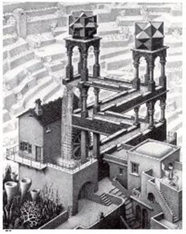 La litografia Cascata presenta un anello "eternamente discendente", proprio come l'Offerta Musicale di Bach. E' il prodotto dell'incrocio di due triangoli di Penrose.