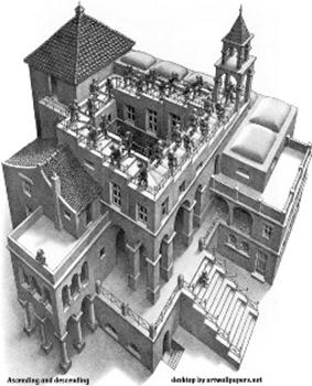 La seconda, Salita e Discesa, analogamente presenta chiaramente un altro esempio di cosa sia uno Strano Anello; se osserviamo ogni singolo omino abbiamo la netta sensazione che stia salendo o scendendo dalla scala, ma nel complesso vediamo che in realtà nessuno sale e nessuno scende, la scala non va né su né giù, ritorna su se stessa.