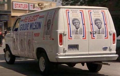 Figura 5.5 - Goldie Wilson che si dimostra entusiasta all'idea di diventare sindaco (1955) e furgoncino per la campagna elettorale (1985).