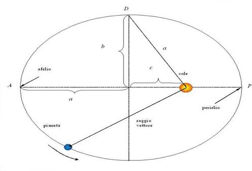 A causa della forma ellittica, così, la distanza dal Sole dei pianeti in movimento non è costante, ma cambia continuamente, ed il punto dell'orbita più vicino è detto perielio, quello più lontano afelio. La linea che congiunge tali punti è la cosiddetta linea degli apsidi. Ecco una delucidazione grafica della prima legge:
