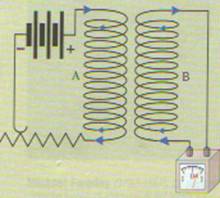 La bobina A è alimentata da una batteria ed è provvista di un interruttore, mentre la bobina B fa parte di un circuito in cui è inserito soltanto uno strumento rilevatore di correnti, particolarmente sensibile, in genere un milliamperometro o un galvanometro.