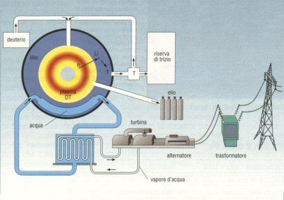 Questo è lo schema di un reattore nucleare a fusione di tipo tokamak. Il plasma di deuterio e trizio è mantenuto lontano dalle pareti del contenitore da intensi campi elettromagnetici. Una frazione dei neutroni prodotti dalla fusione di deuterio e di trizio serve a produrre altro trizio mediante una reazione che avviene nello strato di litio intorno al plasma. L'elio, un altro prodotto della fusione, è raccolto fuori dal reattore. Il calore che si sprigiona a causa delle reazioni di fusione viene portato via dall'acqua come in un reattore a fissione.
